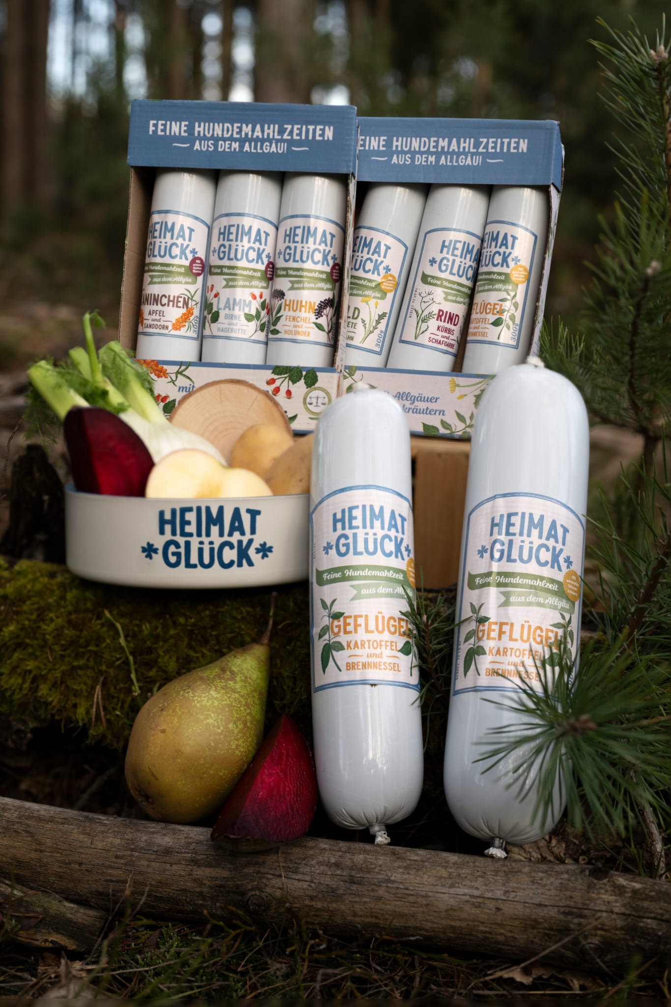 Heimatglück Hundenahrung wird mit Liebe und Sorgfalt im Allgäu unter Einbeziehung regionaler Produkte und Lieferanten hergestellt. Durch das langsame Garen im Wasserbad bleiben in Heimatglück Hundewürsten besonders viele Nährstoffe erhalten. Angereichert mit wertvollen Wiesenkräutern und dank dem Reico Vital-System schaffen die Hundewürste ein mineralisches Gleichgewicht. Die praktische Wurstform spart zusätzlich auch noch Verpackungsmüll!